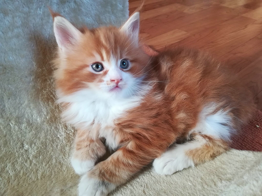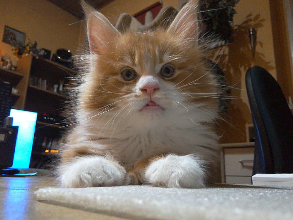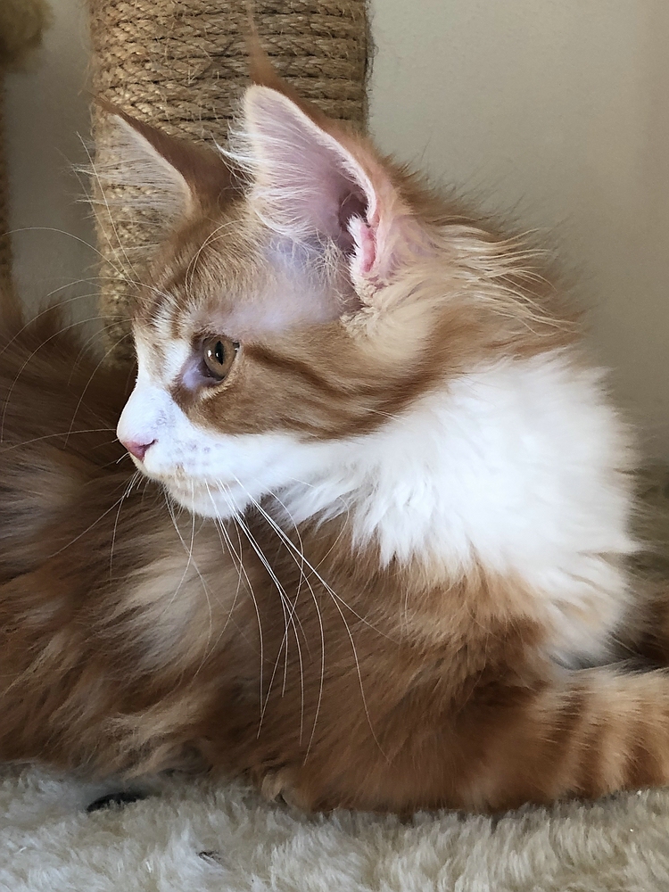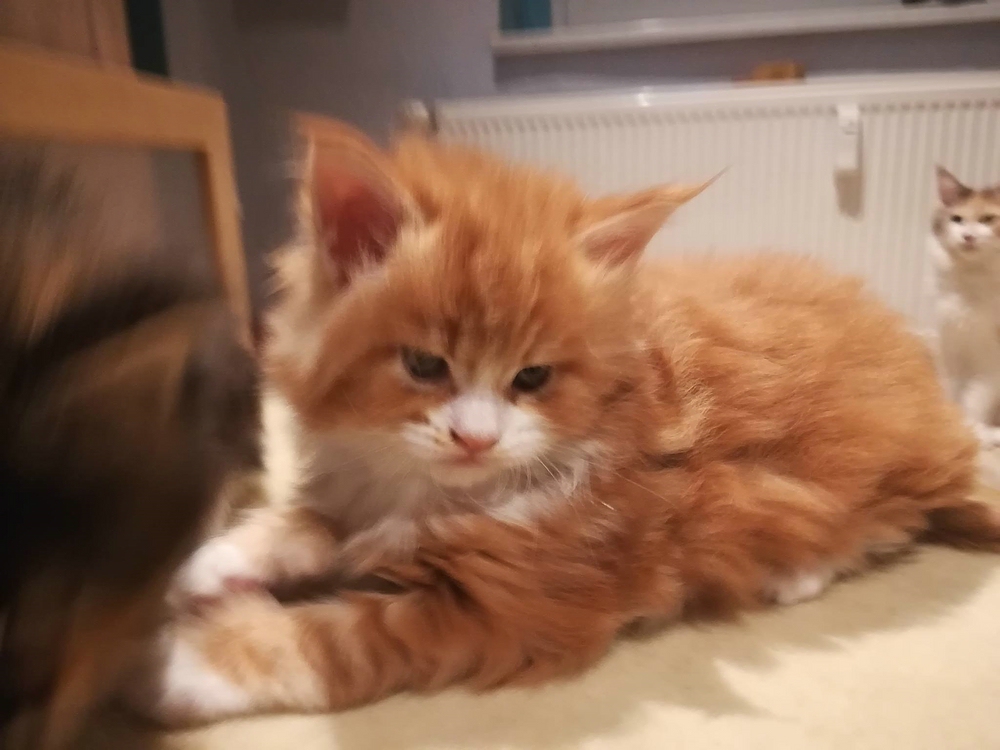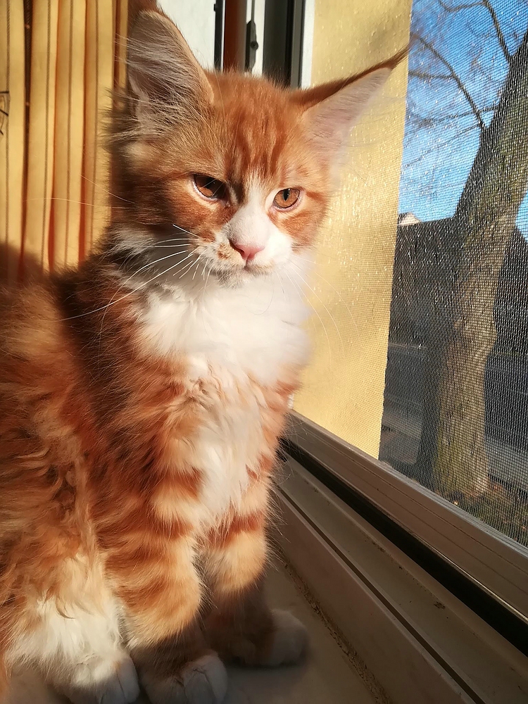 Bei meiner Geburt wog ich 165g. Mittlerweile wiege ich über 8 kg. Ich will ja mal ein stattlicher Kater werden. Immerhin muss ich mich gegen 2 Schwestern behaupten. Ich bin ein Poly in red classic white.