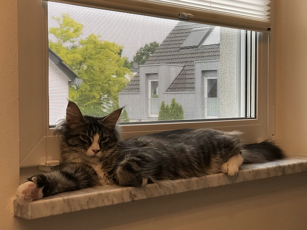 Hier kann ich mich richtig Lang machen. Ab und zu teile ich mir die Fensterbank auch mit Pepper und Peter. Ich bin ja nicht so...