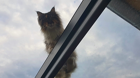 Heute Morgen, die Vögel zwitscherten so schön und Frauchen war noch im Land der Träume habe ich ein neues Ausflugsziel für mich entdeckt! Wir ihr ja wisst habe ich ja Polypfoten und mit denen lässt sich so allerhand anstellen. Ich habe es geschafft die Fliegengittertüre im Schlafzimmer zu öffnen. Es heisst zwar die Taube auf dem Dach ist besser als der Spatz auf der Hand. Aber Katz auf dem Dach ist auch besser als im Zimmer. Meine Geschwister haben blöd aus der Wäsche geguckt und sich nicht getraut. Nur kam ich nicht wieder rein. Der unrasierte Dosenöffner musste dann die Leiter aus dem Schuppen holen und mich vom Dach pflücken. Jetzt hat der doch glatt nen Riegel eingebaut und nix ist mehr mit Dachausflug.