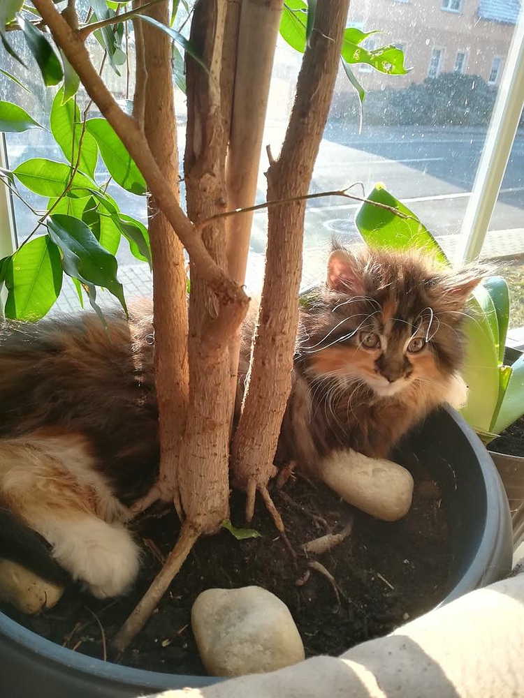 Ich war heute zum ersten Mal auf dem Kratzbaum. Meine zweibeinige Mama hat mich nicht den Blumentopf erkunden lassen! Die hat mich einfach vorher vom Fensterbrett gepflückt.